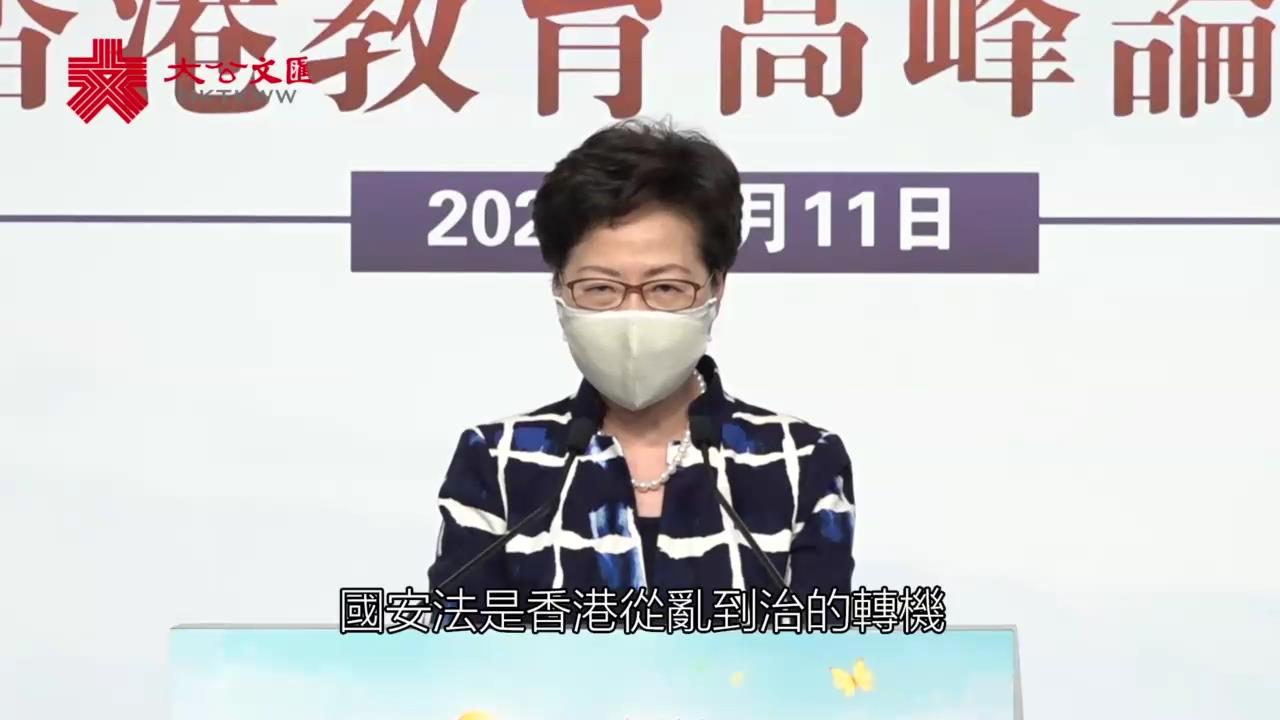 由香港文匯報與香港教育工作者聯會(教聯會)共同舉辦的香港教育高峰論壇今日(11日)上午10時在香港會展中心舉行。香港行政長官林鄭月娥致辭時表示,在教育層面,國家安全不是單一的議題,國安法是香港走出困局、從亂到治的轉機,也是讓教育回歸教育,讓學生的學習重回正軌的轉機,港府將與教育界攜手努力培養青年人具有國家觀念,香港情懷,國際視野的有素質的新一代。