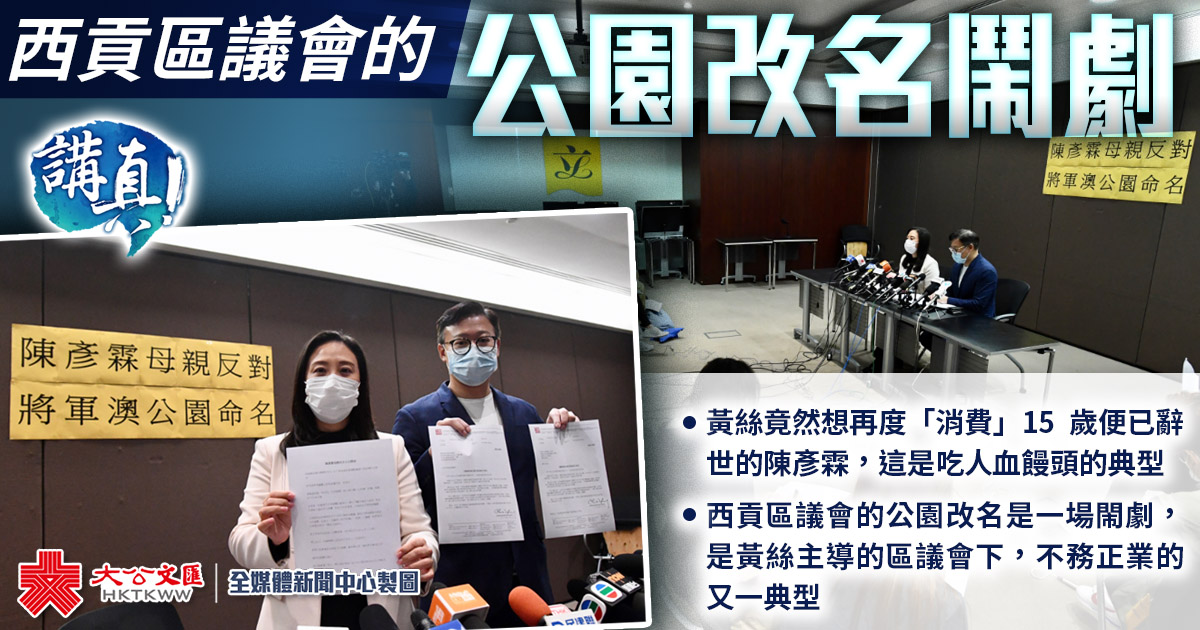 陳彥霖母親不堪去年逝世的女兒被黃絲再度「消費」, 上周日透過民建聯立法會議員反對西貢區議會把區內公園改名為「陳彥霖紀念公園」,這是應有之義。一個母親在去年9 月才經歷喪女之痛, 去年已站出來澄清, 希望各界還女兒及她們一家清靜。 怎知去年 11 月24日區議會改選, 黃絲幾乎主導了全港各區議會後, 勝利沖昏頭腦,竟然想再度「消費」15 歲便已辭世的陳彥霖,這是吃人血饅頭的典型。
